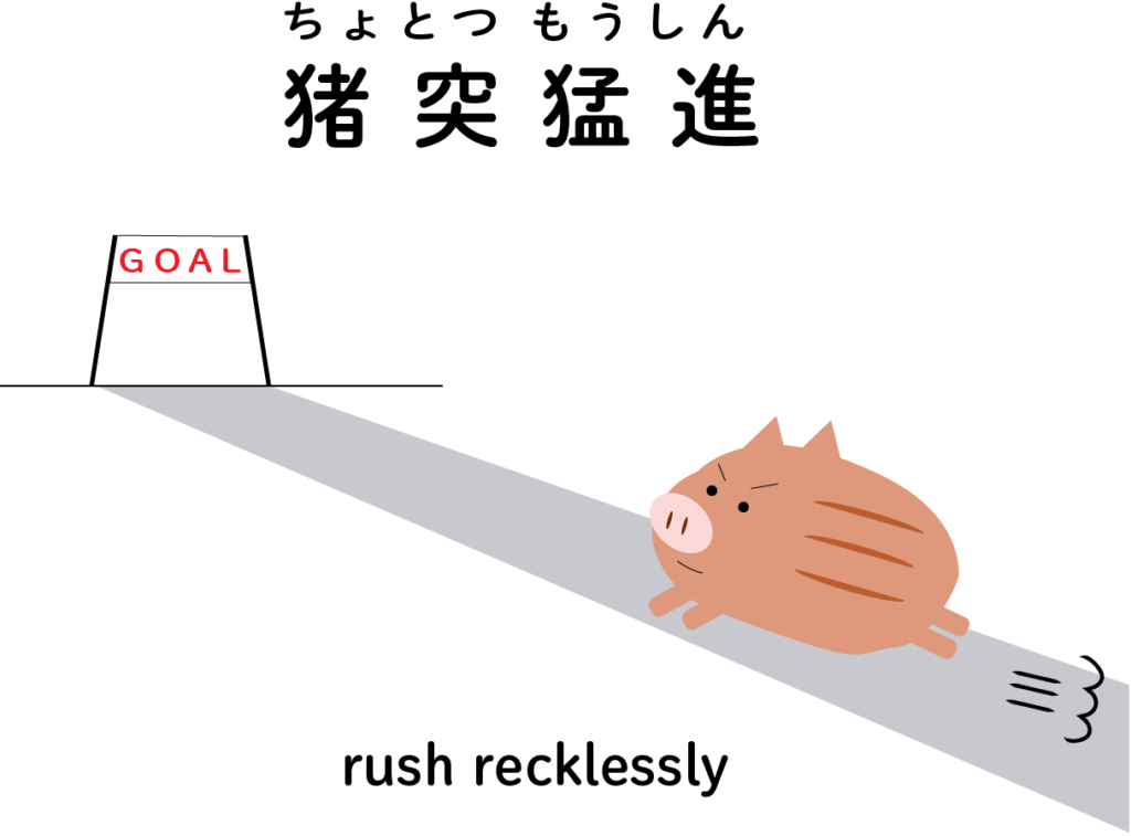 【ことわざ】猪突猛進 (ちょとつもうしん)フリーイラスト/rush recklessly/free images さ行のイラスト 2024.02.21 スポンサーリンク 猪突猛進 (ちょとつもうしん)フリーイラスト 初級後半〜中級のクラスに。 他の、四文字熟語・ことわざはこちら 【ことわざ】千里の道も一歩から(せんりのみちもいっぽから)フリーイラスト/A journey of a thousand miles begins with a single step./free images里の道も一歩から(せんりのみちもいっぽから)フリーイラスト 初級後半〜中級のクラスに。 千里の距離ってどれぐらい?だと思いますか?一里=約3.9Kmだそうです。千里=3900Km!(日本の国土の長さが約3000Km) などのやりとりもできそ... 【ことわざ】覆水盆に返らず(ふくすいぼんにかえらず)のフリーイラスト英訳と比較すると文化や表現の違いも説明できますね。 覆水盆に返らずのイラスト 覆水盆に返らずのイラストを拡大png形式でダウンロードする ことわざをイラストで表現してみました。 漢字を覚えてくると、ことわざや四文字熟語に興味を示す学生も多か... 【四文字熟語】十人十色(じゅうにんといろ)フリーイラストオランダでの教育実習時、四文字熟語やことわざに興味を持ってくれる学生さんが多くて手書きのイラストを描いていたことを思い出しつくってみました。四文字熟語やことわざのイラストも更新していく予定です。 十人十色のイラスト 十人十色のイラストを拡大...